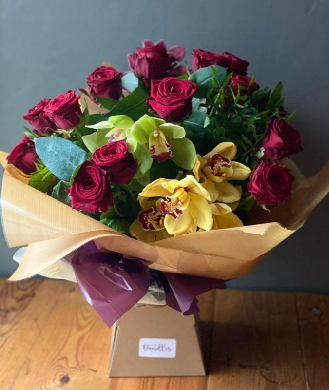My bundle of long stem red roses and cymbidium orchids with a choice of foliage. Sent as a tied bundle in water this an exquisite romantic gift.